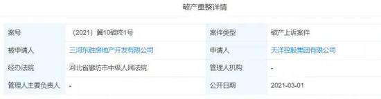 然而,在开庭之前的2021年3月1日,“天洋燕郊创新中心”项目融资方之一东胜公司已经被申请破产重整。
