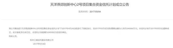 据悉,2017年4月,杭州工商信托先后发行“天洋燕郊创新中心1号”(以下简称“天洋1号”)及“天洋燕郊创新中心2号”以下简称“天洋2号”)两款集合信托计划,期限3年,实际募集规模34亿元。