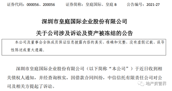 5月18日,皇庭国际发布公告称,近日因借款合同纠纷,中信信托有限责任公司对公司及相关方提起了诉讼,申请查封了深圳融发投资有限公司名下位于深圳市福田区中心区晶岛国商购物中心(即皇庭广场)的不动产,查封期限为36个月。