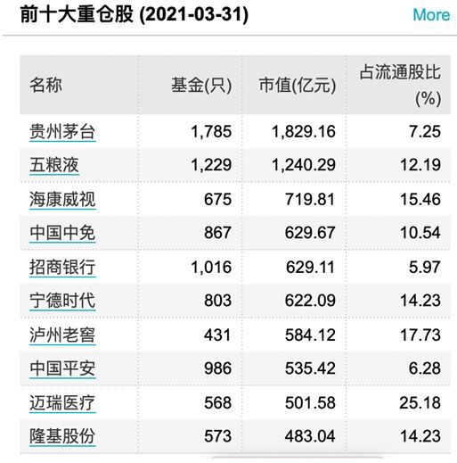 截至2021年一季度,公募基金的前十大重仓股为贵州茅台、五粮液、海康威视、中国中免、招商银行、宁德时代、泸州老窖、中国平安、迈瑞医疗和隆基股份。