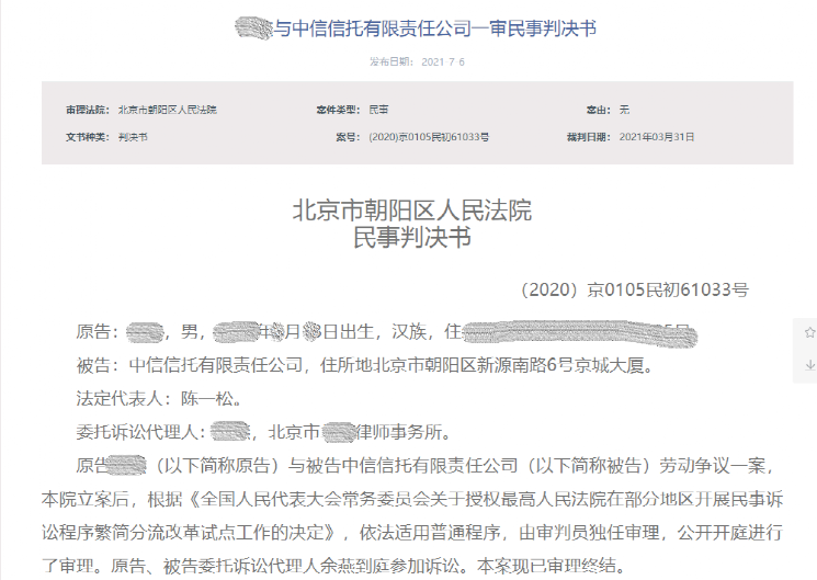 杨先生被中信信托辞退后,与老东家打了四年官司。最终,北京朝阳区法院判决,中国新信托支付杨先生工资及赔偿金近70万元。
