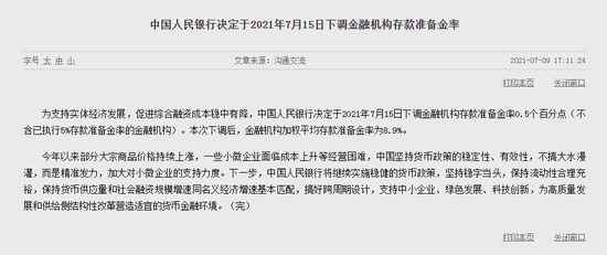 为支持实体经济发展,促进综合融资成本稳中有降,中国人民银行决定于2021年7月15日下调金融机构存款准备金率0.5个百分点(不含已执行5%存款准备金率的金融机构)。本次下调后,金融机构加权平均存款准备金率为8.9%。