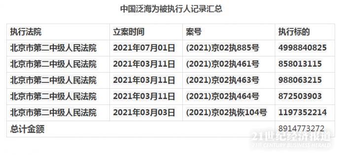 21世纪经济报道记者查询中国执行信息公开网发现,中国泛海列入被执行人的标的额总计已高达89亿元。