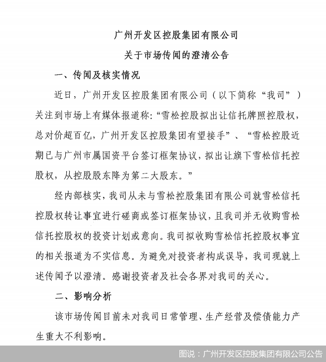 广州开发区控股表示,经内部核实,该公司从未与雪松控股就雪松信托控股权转让事宜进行磋商或签订框架协议,且该公司并无收购雪松信托控股权的投资计划或意向,拟收购雪松信托控股权事宜的相关报道为不实信息。“