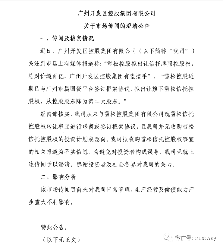广州开发区控股集团表示,从未与雪松控股集团就雪松信托控股权转让事宜进行磋商或签订框架协议,且并无收购雪松信托控股权的投资计划或意向。“我司拟收购雪松信托控股权事宜的相关报道为不实信息。”
