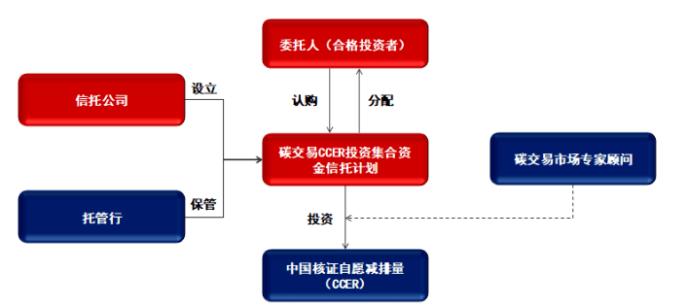 该项目的交易结构为:由中融信托作为受托人,在投资顾问上海宝碳新能源环保科技有限公司(简称“上海宝碳”)的建议下,将信托资金投资于碳排放权交易所上市的中国核证自愿减排量(CCER),并适时参与碳市场交易。