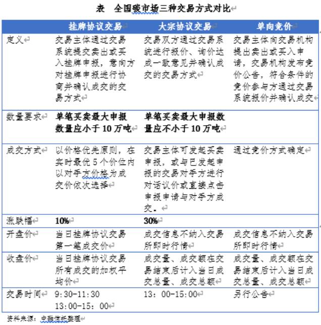 2021年5月19日,生态环境部发布《碳排放权登记管理规则(试行)》、《碳排放权交易管理规则(试行)》和《碳排放权结算管理规则(试行)》,在碳排放权登记、交易和结算三方面搭建起具体框架,并明确暂时由湖北碳排放交易中心负责注册登记等相关工作,由上海环境能源交易所负责交易的相关工作。2021年6月22日,上海环境能源交易所发布《关于全国碳排放权交易相关事项的公告》,就不同类型交易的涨跌幅限制、交易时段等作出规定。全国碳市场将采用挂牌协议转让、大宗协议转让以及单向竞价三种交易方式(具体见下表);交易单位以每吨二氧化碳当量(tCO2e)申报,申报量最小变动为1 tCO2e,价格最小变动为0.01元;采用全额申报方式,即卖出交易产品的数量,不超过交易账户内额交易数量,买入交易产品的资金,不超过交易账户内可用资金。
