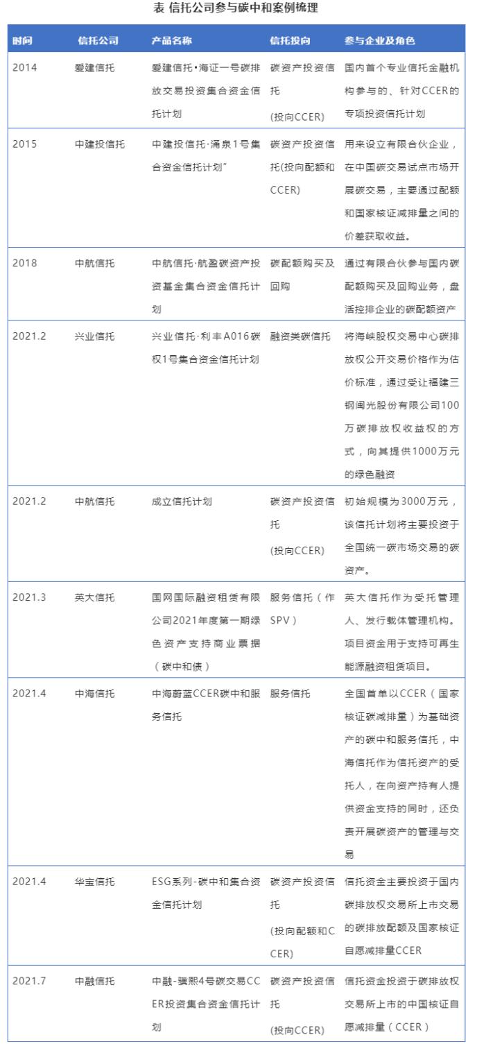 以华宝信托为例,今年4月,华宝信托成立“ESG系列-碳中和集合资金信托计划”,信托资金主要投资于国内碳排放权交易所上市交易的碳排放配额及国家核证自愿减排量CCER。