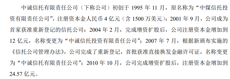2007年7月,根据新颁布实施的《信托公司管理办法》,其完成了重新登记,首批获准直接换发金融许可证,名称变更为“中诚信托有限责任公司”;2010年10月,中诚信托完成增资扩股后,注册资本金增加到24.57亿元。