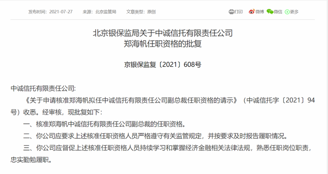 日前,北京银保监局发布《关于中诚信托有限责任公司郑海帆任职资格的批复》,核准了郑海帆中诚信托副总裁的任职资格。