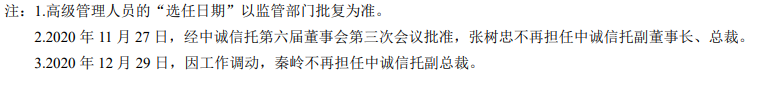 年报信息显示,2020年11月27日,经中诚信托第六届董事会第三次会议批准,张树忠不再担任中诚信托副董事长、总裁。2020年12月29日,因工作调动,秦岭不再担任中诚信托副总裁。