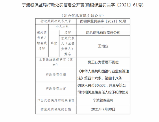8月6日消息,宁波银保监局行政处罚信息公开表显示,昆仑信托有限责任公司因员工行为管理不到位,被罚款人民币30万元,并责令该公司对相关直接责任人给予纪律处分。3YD财经新闻网