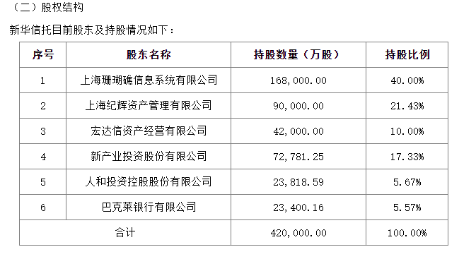 目前,新华信托股东及持股情况如下:上海珊瑚礁信息系统有限公司(40.00%)、上海纪辉资产管理有限公司(21.43%)、宏达信资产经营有限公司(10.00%)、新产业投资股份有限公司(17.33%)、人和投资控股股份有限公司(5.67%)和巴克莱银行有限公司(5.57%)。