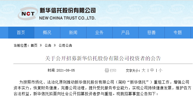 8月5日,新华信托在官网发布公告,拟面向社会公开招募投资者参与重组。