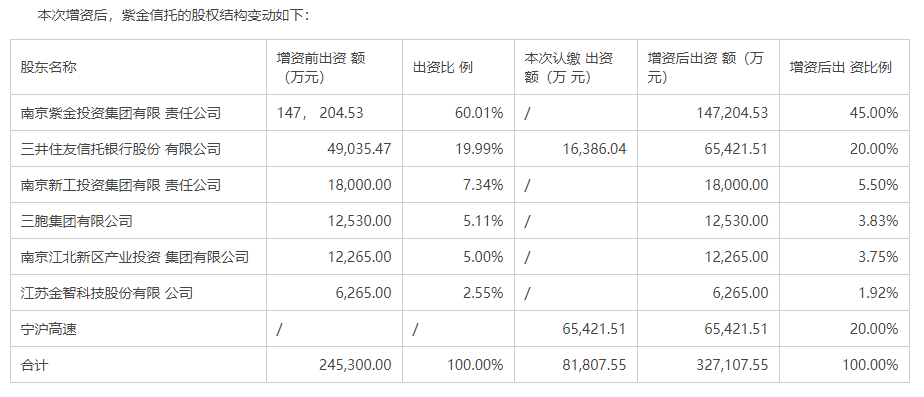 根据相关公告,紫金信托的增资方案为:增加注册资本至人民币32.71亿元,共增加注册资本8.18亿元。其中,宁沪高速认缴紫金信托人民币6.54亿元新增注册资本,增资后所占股权比例为20%;三井住友认缴紫金信托人民币1.64亿元新增注册资本,增资后所占股权比例为20%。