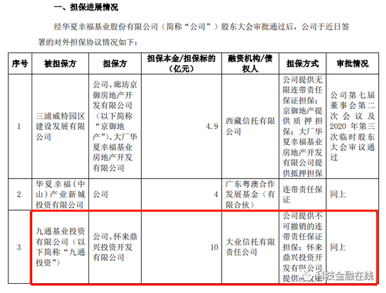 2020年9月12日,上市公司华夏幸福发布一则关于公司提供担保的进展情况公告,其中提到近期华夏幸福、怀来鼎兴投资开发有限公司(简称“怀来鼎兴”,系华夏幸福全资间接控股公司)共同为九通投资提供担保。其中,华夏幸福提供不可撤销的连带责任保证担保,怀来鼎兴提供应收账款质押担保,担保本金10亿元。