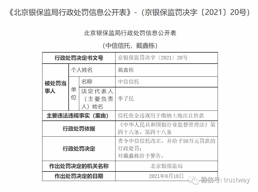 8月24日,银保监会网站公布的《北京银保监局行政处罚信息公开表》(京银保监罚决字〔2021〕20号)显示,因信托资金违规用于缴纳土地出让价款,中信信托被处以50万元罚款;并对员工戴鑫栋给予警告。