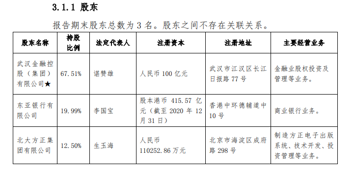 记者注意到,增资后,国通信托的股东名称、出资金额(注册资本)及出资比例为:武汉金融控股(集团)有限公司出资人民币31.19亿元,出资比例75%;东亚银行有限公司出资人民币6.4亿元,占比15.38%;北大方正集团有限公司出资人民币4亿元,占比9.62%。