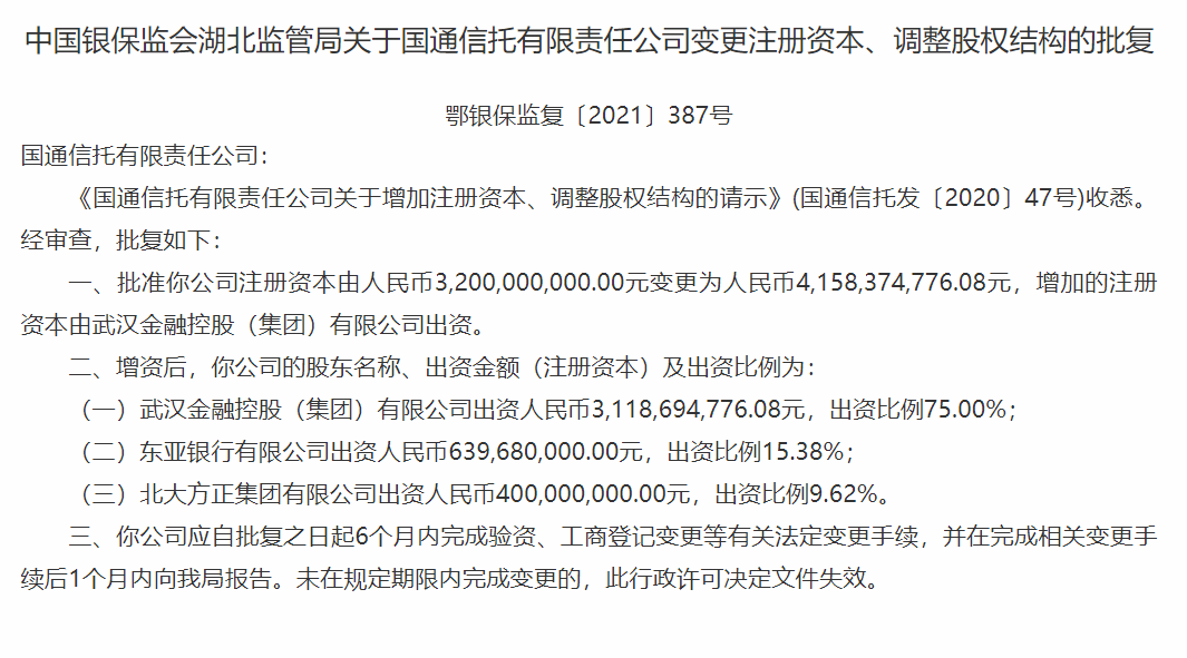 9月15日,记者获悉,中国银保监会湖北监管局已发布《关于国通信托有限责任公司变更注册资本、调整股权结构的批复》(下称《批复》)。