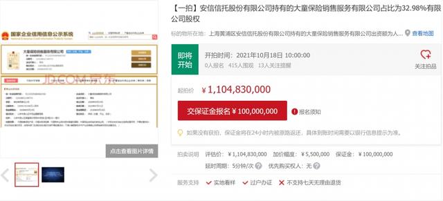 2021年10月18日至10月20日,上海金融法院将在司法拍卖网络平台,对安信信托股份有限公司(安信信托600816)持有的大童保险销售服务有限公司(大童保险)出资额4978.1344万元(占比32.9792%)股权,进行公开拍卖,起拍价11.0483亿元。