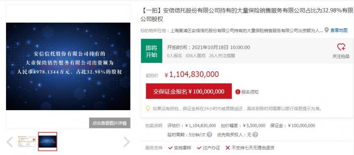 近日,人民法院诉讼资产网发布公告称,上海金融法院将于2021年10月18日10时起至2021年10月20日10时止(延时除外)在“京东网”上进行公开网络司法拍卖,拍卖标的为,安信信托持有的大童保险销售服务有限公司(下称“大童保险”)出资额为人民币4978.1344万元、占比32.9792%的股权,评估价和起拍价为110483万元。