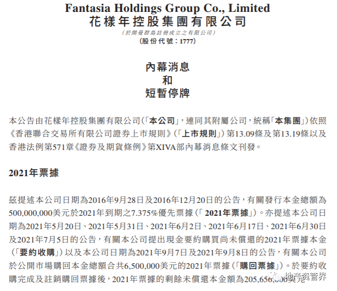 10月4日晚间,花样年控股(HK:01777)发布内幕消息及短暂停牌公告,受疫情反复、行业政策及宏观经济等多重因素的影响,公司流动性出现阶段性紧张,未能在10月4日如期支付2021年票据的剩余本金约2.12亿美元。