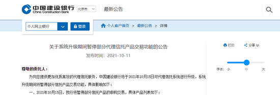 10月11日消息,建行发布关于系统升级期间暂停部分代理信托产品交易功能的公告。公告称,为向您提供更加优质高效的代理信托服务,中国建设银行将于2021年10月15日对代理信托系统进行升级,系统升级期间将暂停部分信托产品交易功能,具体影响如下: