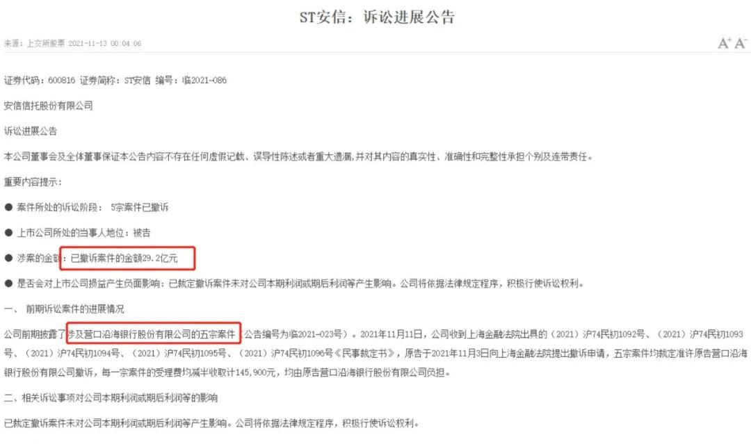 营口沿海银行对安信信托5宗案件已撤诉,已撤诉案件的金额29.2亿元。