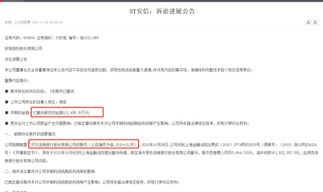 安信前期披露了涉及浙商银行股份有限公司的案件(公告编号为临 2020-011号)。2021年10月29日,公司收到上海金融法院出具的(2020)沪74民初1835号(原案号:(2019)浙01民初4324号)《民事裁定书》,原告于2021年10月9日向上海金融法院提出撤诉申请,裁定准许原告浙商银行股份有限公司撤诉,案件受理费人民币5,664,715元,减半收取计2,832,357.5元,由原告浙商银行股份有限公司负担。