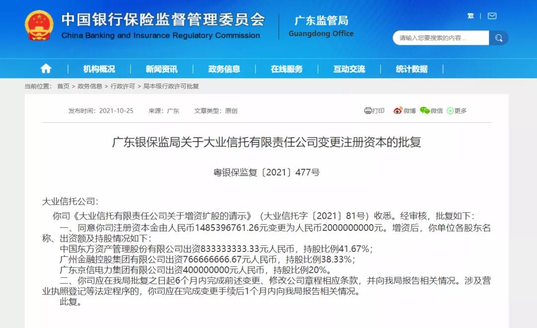 近日,广东银保监局发布《关于大业信托有限责任公司变更注册资本的批复》,同意大业信托注册资本金由人民币14.85亿元变更为20亿元。
