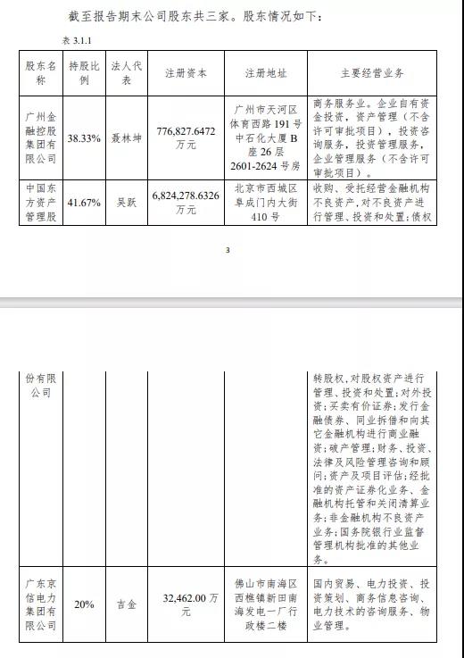 根据大业信托2020年年报,中国东方资产管理股份有限公司、广州金融控股集团有限公司和广东京信电力集团有限公司持股比例分别为41.67%、38.33%和20%。
