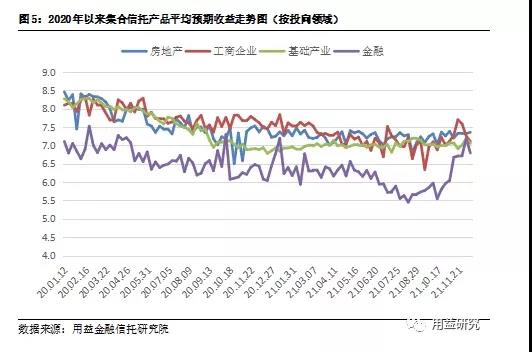 据统计,上周金融类信托产品的平均预期年化收益率为6.79%,环比减少0.40个百分点;房地产类信托产品的平均预期年化收益率为7.36%,环比增加0.03个百分点;工商企业类信托产品的平均预期年化收益率为7.11%,环比减少0.15个百分点;基础产业类信托产品的平均预期年化收益率为7.06%,环比减少0.12个百分点。