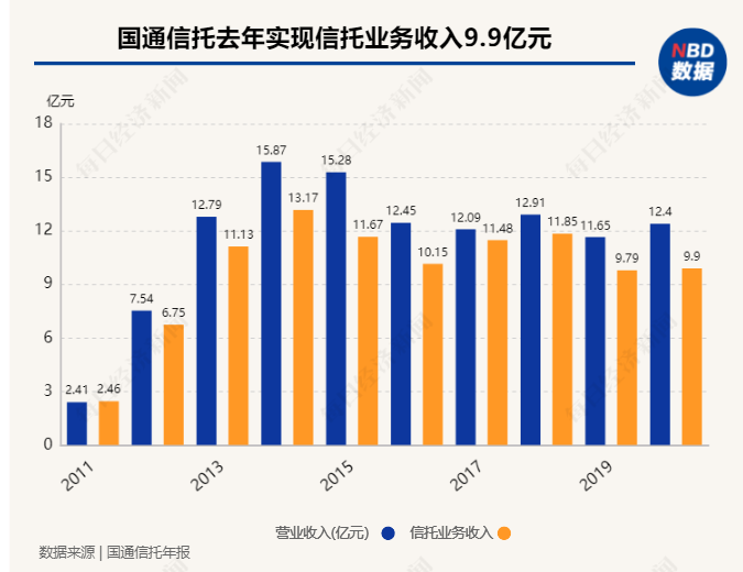 需要注意的是,2019年与2020年,国通信托的信托业务收入(手续费及佣金净收入)别为9.79亿元和9.90亿元,均低于历史平均水平。