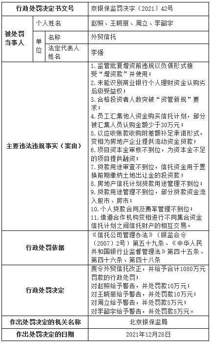 北京银保监局依据《信托公司管理办法》(银监会令〔2007〕2号)第五十九条、《中华人民共和国银行业监督管理法》第四十五条、第四十六条、第四十八条,责令外贸信托改正,并给予合计1080万元罚款的行政处罚;对相关责任人赵照给予警告,并处罚款10万元;对王晓丽给予警告,并处罚款10万元;对周立给予警告,并处罚款5万元;对李韶宇给予警告,并处罚款5万元。