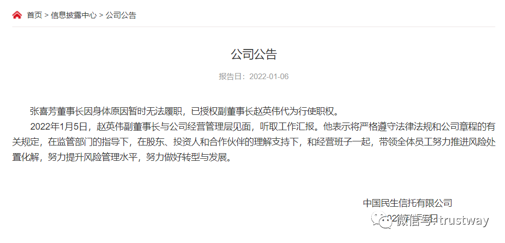 民生信托昨日发布公告称,张喜芳董事长因身体原因暂时无法履职,已授权副董事长赵英伟代为行使职权。