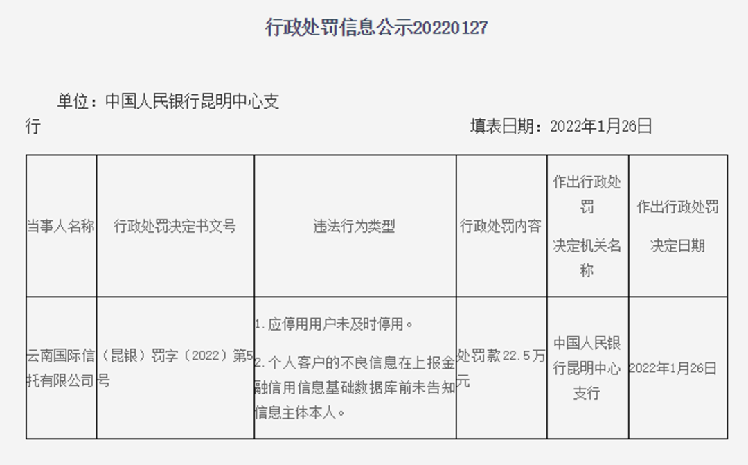 1月27日,中国人民银行昆明中心支行公布一则行政处罚公示表,云南国际信托有限公司(下称“云南信托”)因“应停用用户未及时停用。”以及“个人客户的不良信息在上报金融信用信息基础数据库前未告知信息主体本人。”两项违法行为被处罚款22.5万元。
