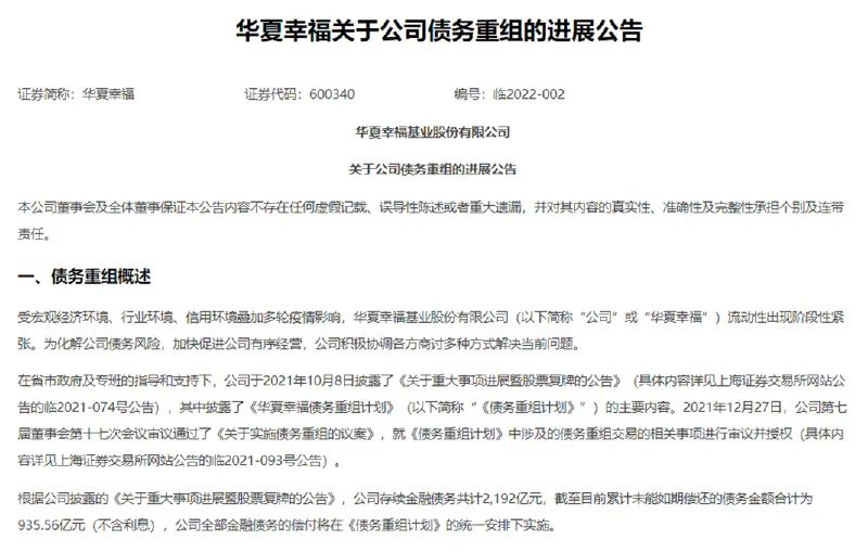 此前,华夏幸福发布了关于公司债务重组的进展公告。该公告显示,根据2021年10月公司披露的《关于重大事项进展暨股票复牌的公告》,公司存续金融债务共计2192亿元,截至目前累计未能如期偿还的债务金额合计为935.56亿元(不含利息)。截至2022年1月19日,华夏幸福及下属子公司与相关债权人签署的《债务重组协议》涉及公司及下属子公司债务金额累计为88.57亿元,减免债务利息、豁免罚息共计5.47亿元,占公司最近一期经审计归属于公司股东的净利润36.65亿元的14.91%。上述已签署《债务重组协议》的债务中,债券及债务融资工具债务金额为84.07亿元,其他金融债务金额为4.5亿元,均适用“兑”“抵”“接”的偿还方式。公司将坚决恪守诚信经营理念,积极解决当前问题,落实主体经营责任。以“不逃废债”为基本前提,按照市场化、法治化、公平公正、分类施策的原则,稳妥化解华夏幸福债务风险,依法维护债权人合法权益。