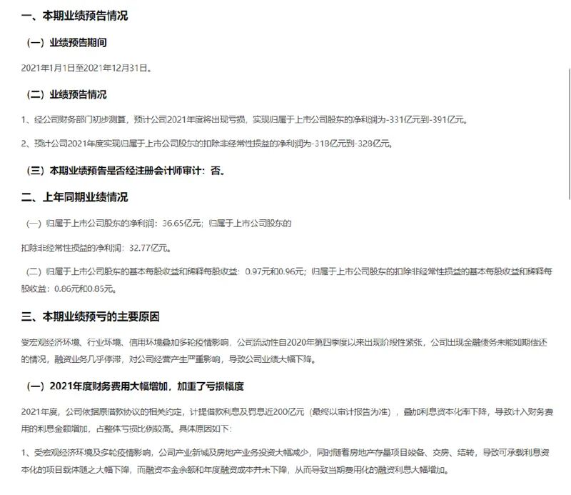 春节前夕,华夏幸福发布业绩预告称,预计公司2021年度实现归属于上市公司股东的净利润为-331亿元到-391亿元。预计公司2021年度实现归属于上市公司股东的扣除非经常性损益的净利润为-318亿元到-328亿元。金融机构债权人委员会已于2021年12月9日表决通过《债务重组计划》,目前正在加快推进债务重组协议的签署。根据《债务重组计划》,债务重组协议签署后,预计公司未支付的借款利息将被减免、产生的罚息将被豁免,根据企业会计准则的相关规定,上述利息减免、罚息豁免将产生债务重组收益。