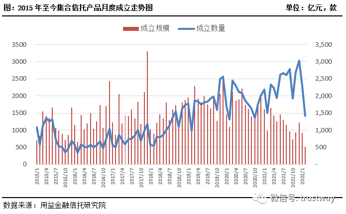 另据公开资料不完全统计,截至2022年3月4日,2月共计成立集合信托产品1408款,与上月同时点相比减少38.83%,成立规模506.44亿元,与上月同时点相比减少44.94%;与去年同期相比,集合信托产品的成立规模大幅下滑48.43%。
