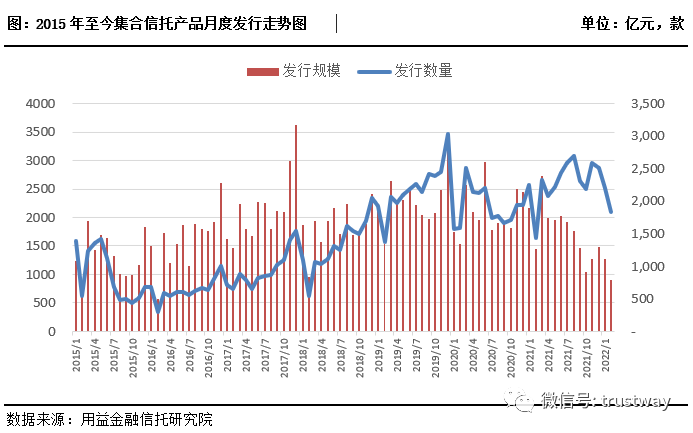 据公开资料不完全统计,截至2022年3月4日,2月共计发行集合信托产品1831款,环比减少16.77%,发行规模900.13亿元,环比减少28.91%;与去年同期相比,集合信托产品发行规模下滑了37.76%。