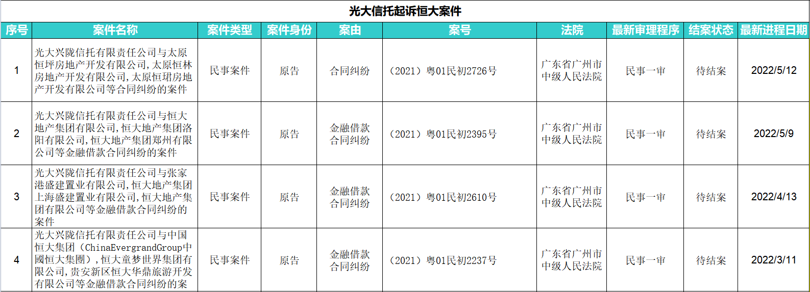 企查查显示,光大信托与恒大相关联的案件共有66起,均为合同纠纷,目前均为民事一审程序,有4起案件尚未开庭。相关案件中,有4起案件为光大信托起诉恒大,另62起案件中,光大信托与恒大作为共同被告被诉。