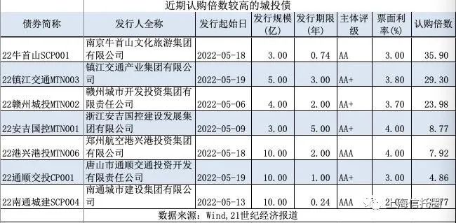 21世纪经济报道记者根据Wind数据梳理发现,近期城投债高认购倍数的案例并不少。比如“22牛首山SCP001”、“22镇江交通MTN003”、“22赣州城投MTN002”认购倍数均超过20倍。