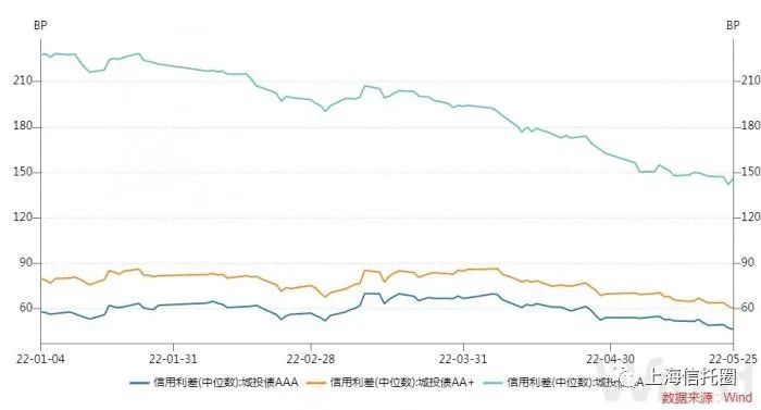 Wind数据显示,5月25日AAA级、AA+级、AA级城投利差(中位数)分别为46BP、60BP、145.92BP,分别相比4月底压缩20BP、24BP、48BP——低等级反而压缩越大,反映市场机构在下沉。