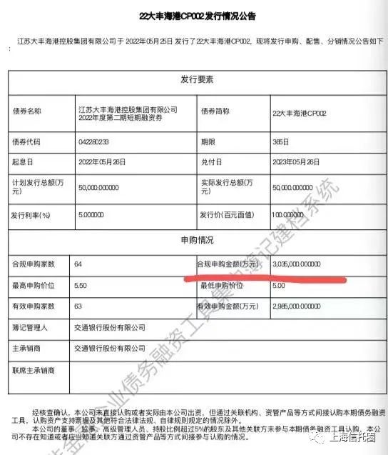 5月26日,江苏大丰港控股有限公司公告称,该公司5月25日成功发行“22大丰港CP002”。该债券计划发行总额5亿,实际发行总额5亿,票面利率5%。