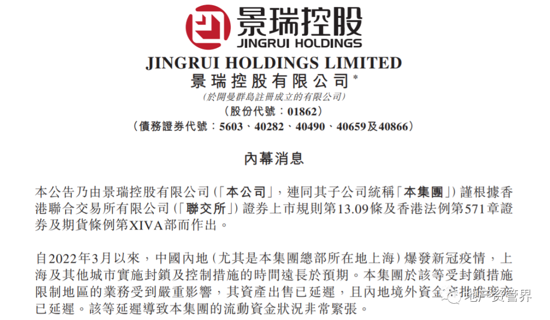 据公告披露,自2022年3月以来,内地新冠疫情爆发,上海及其他城市实施封锁及控制措施时间远长于预期,景瑞控股业务受到严重影响,其资产出售已延迟,且内地境外资金审批进度也已延迟,公司流动资金状况非常紧张。