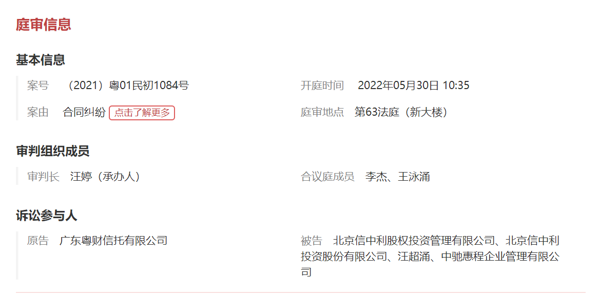 乐居财经讯 7月5日消息,广东粤财信托有限公司(以下简称“粤财信托”)新增1则开庭公告,案由系合同纠纷 。案件原告为粤财信托,被告为北京信中利股权投资管理有限公司、北京信中利投资股份有限公司等。案件案号(2021)粤01民初1084号 。