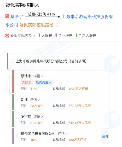 作为上海米哈游网络科技股份有限公司的创始人,蔡浩宇实际拥有公司41%的股份。