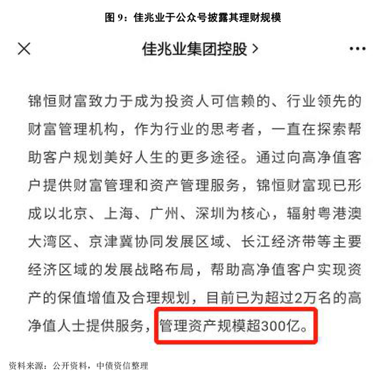 公开报道称锦恒财富理财产品规模约127亿元,结合此前锦恒财富公众号“已为超过2万名的高净值人士提供服务,管理资产规模超300亿”判断,推测佳兆业理财产品规模约100~300亿元。