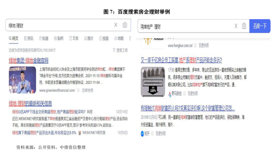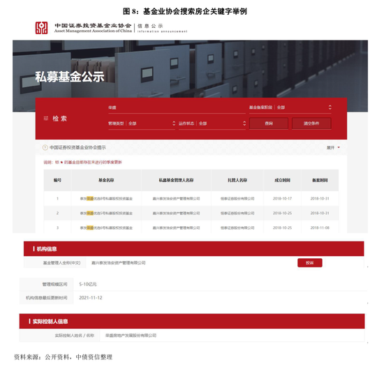 (一)、搜索房企是否存在理财平台:方法一:使用百度进行搜索,关键字“房企+理财/财富/金服”(图7),可找到部分房企设立理财平台独立网页;方法二:通过基金业协会、地方金交所等理财产品备案机构网站查询,以房企为关键字搜索(图8),根据产品名称、基金管理人名称进一步查询相关信息;方法三:通过天眼查等工具查看房企股东或高管名下是否有理财/财富类平台;方法四:通过房企员工、业界打听。