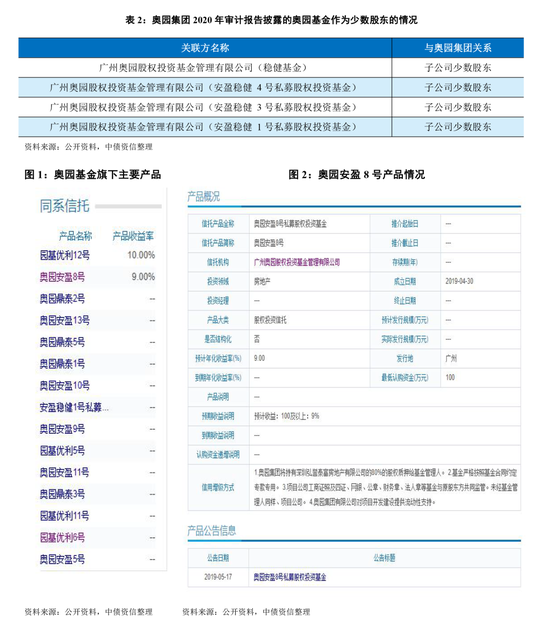 奥园体系的内部理财平台为广州奥园股权投资基金管理有限公司(以下简称“奥园基金”)。通过天眼查,奥园基金为奥园集团有限公司(以下简称“奥园集团”)100%持股,奥园集团为奥园体系境内的主要经营主体,其间接控股股东为中国奥园(3883.HK)。